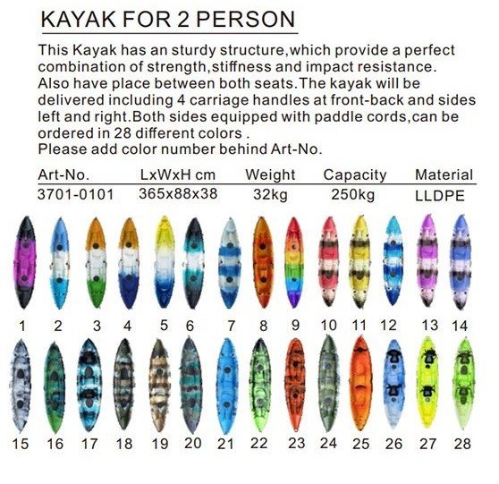 This Kayak has an sturdy structure,which provide a perfect combination of strength,stiffness and impact resistance. Also have place between both seats.The kayak will be delivered including 4 carriage handles at front-back and sides left and right.Both sides equipped with paddle cords,can be ordered in 28 different colors . Please add color number behind Art-No.